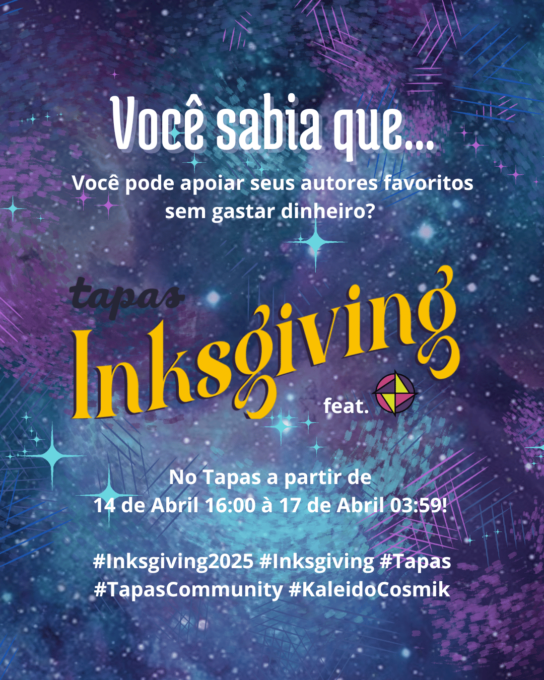 Imagem com fundo de galáxia com os dizeres “Você sabia que… você pode apoiar seus autores favoritos sem gastar dinheiro?” - Tapas Inksgiving, de 14 de abril, 16h, à 17 de abril, 03h59!